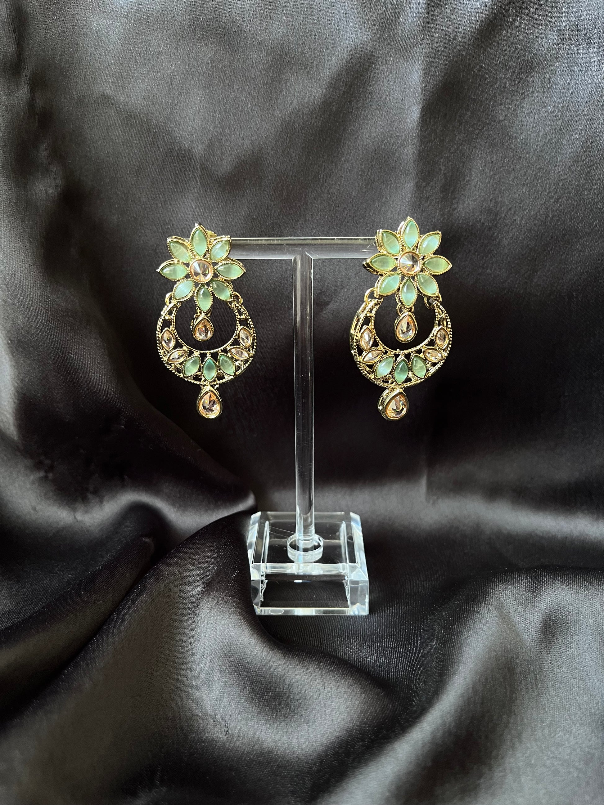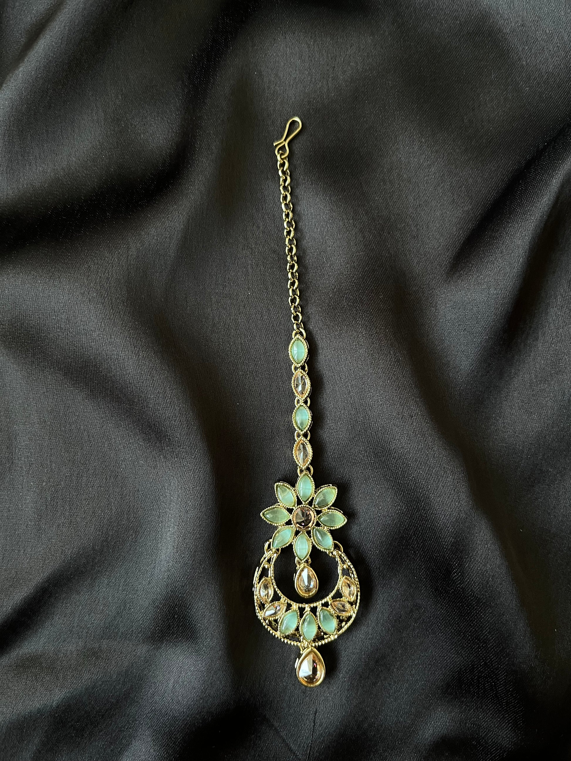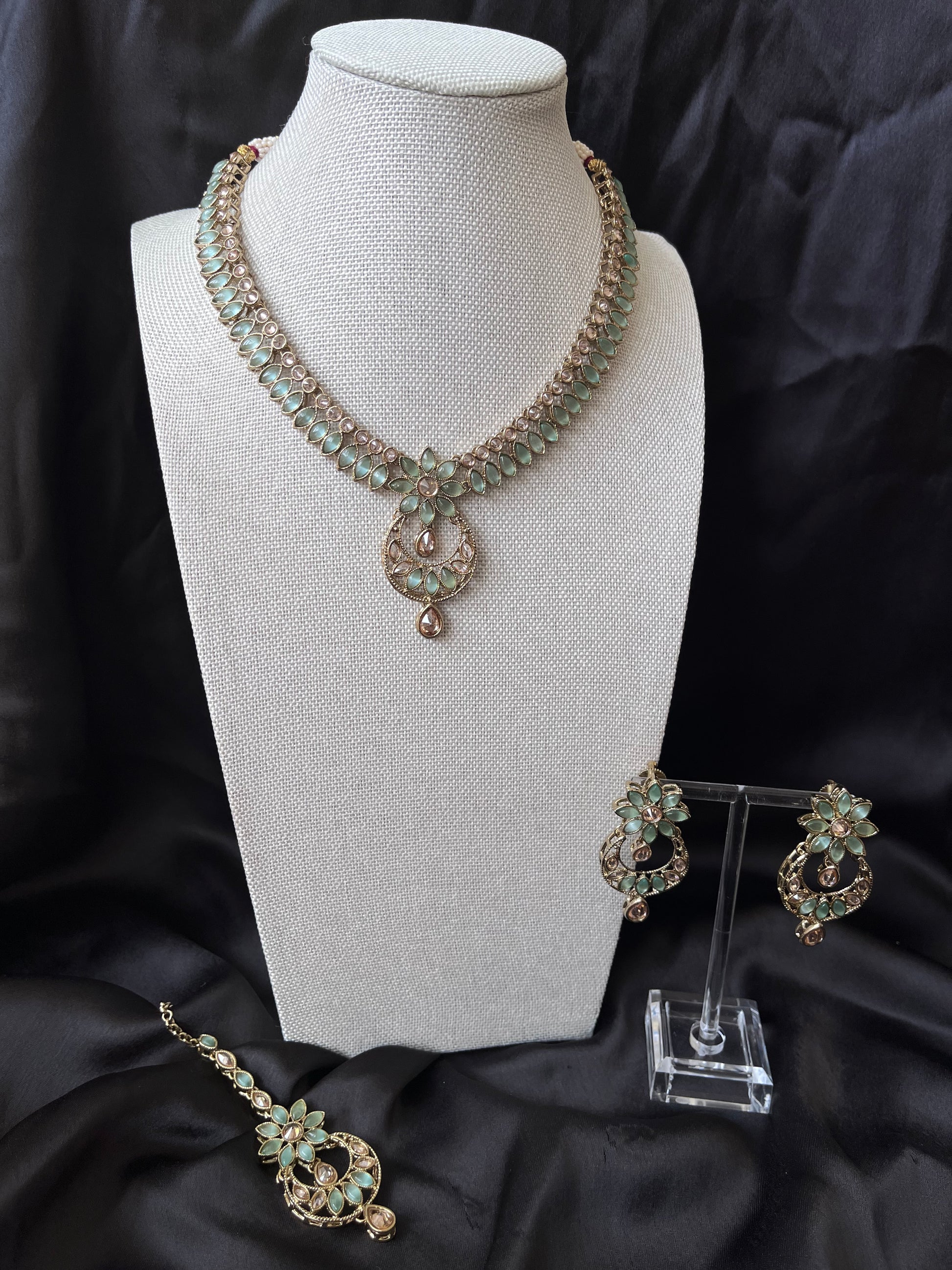 A traditional necklace set with matching earrings & tikka. Perfect for a deep/ V neck neckline.